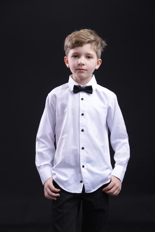 חולצה לבנה מכופתרת עם מכנס שחור ופפיון תואם לבר מצווה | שושבינים