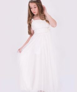 שמלת בת מצווה בצבע שמנת, חלק עליון עם כיווצים.