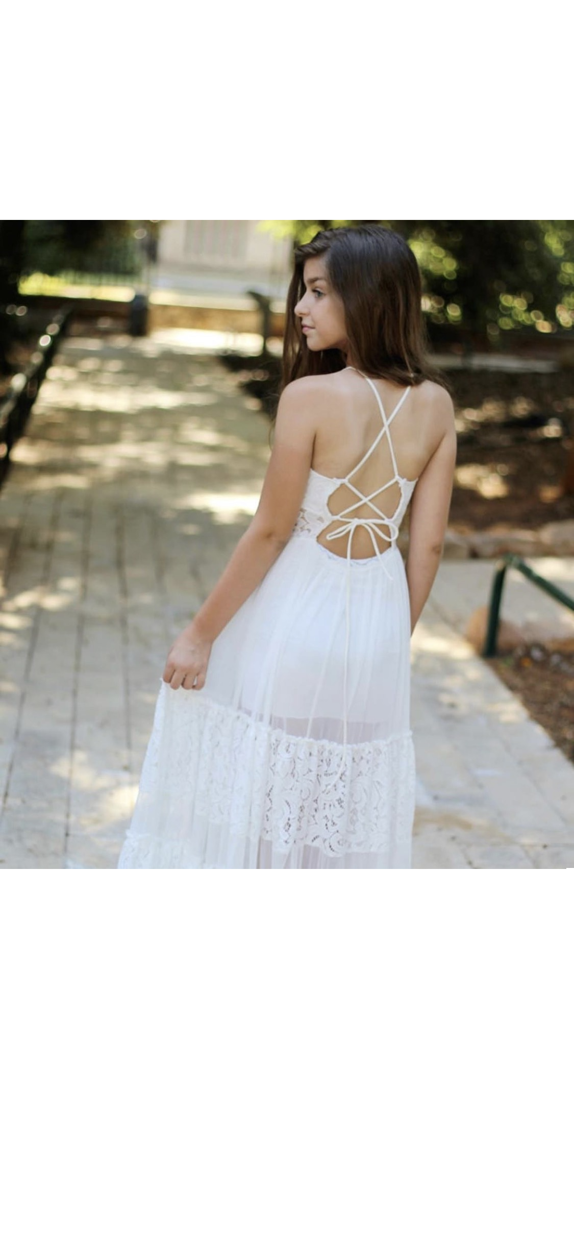 שמלת בת מצווה מקסי בשילוב תחרה מהממת וגב פתוח עם איקסים.