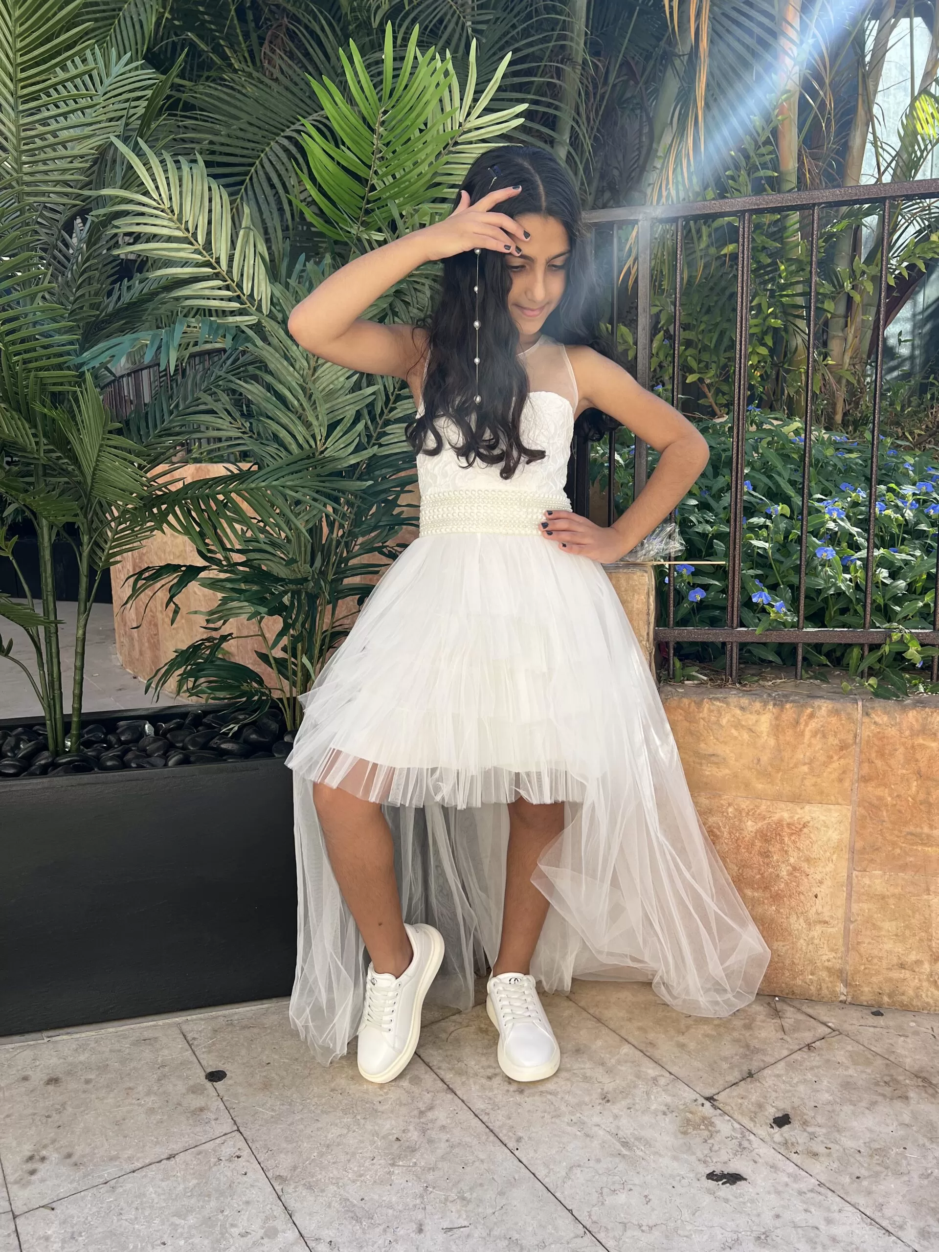 חצאית של השמלה נפוחה, שכבות של טול עדין ועליה בד טול טול בגזרת שובל פתוח וארוך מעט מעל הרצפה על מנת שלכלת בת מצווה יהיה נוח בשמלת בת מצווה של חלומותיה.