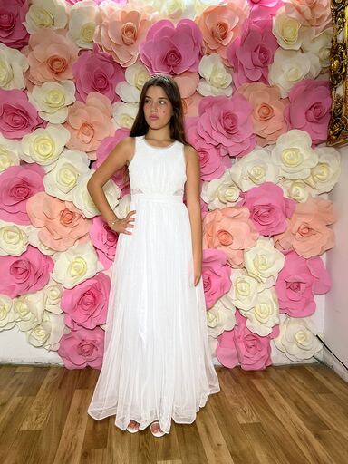 שמלה תפורה מבד טול יקרתי עדין ונשפך על ההגוף. השמלה תפורה בגזרה מקסי, שמלה בת מצווה ארוכה